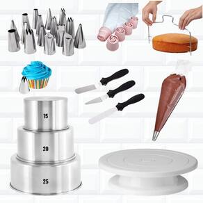 Bailarina polipropileno branca 30 cm Kit formas redondas 10 cm 3 peças 15, 20 e 25 cm Jogo de bico inox 16 peças: 6 crespos nº0 ao nº5 , 6 lisos nº0 ao nº5 , 1 babado padrão , 1 folha padrão , 1 serra médio e 1 rosa médio Kit espátulas alisadoras 3 pçs Jg bico russo plástico 5 pçs Bico 1m Manga descartável 6 unid. Nivelador de bolo