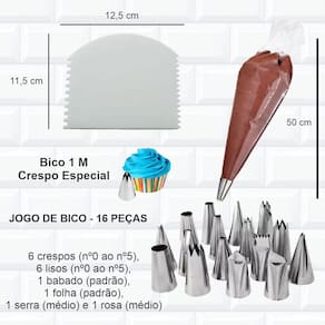 - jogo de bico inox 16 peças: 6 crespos nº0 ao nº5 , 6 lisos nº0 ao nº5 , 1 babado padrão , 1 folha padrão , 1 serra médio e 1 rosa médio
