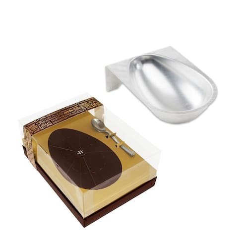 Forma em alumínio liso, de tamanho grande. Vai ao forno e freezer. Com apoio para que a moldura seja perfeita sem elevações na hora do preparo. Compatível com formas ovo de páscoa de 500g.