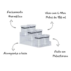 Composto por 6 mini potes de 180ml e um suporte moderno, este kit é a solução perfeita para manter sua cozinha organizada, otimizando o espaço e trazendo um toque de estilo à sua decoração.