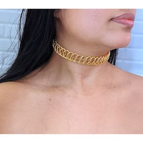Colar rígido tipo gargantilha de aço em círculos dourados de design moderno, perfeito para qualquer ocasião.