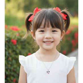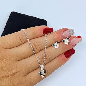 Conjunto Colar e Brincos Infantil Minnie – Charme e Sofisticação com Proteção Folheado a prata com verniz especial, garantindo brilho intenso e durabilidade prolongada. Tecnologia antialérgica, perfeita para a pele delicada das crianças. Corrente com aproximadamente 36 cm + extensor de 5 cm, brinco e pingente com cerca de 0,7 cm. Design clássico e delicado, ideal para ocasiões especiais ou para completar o visual do dia a dia com um toque de elegância.
