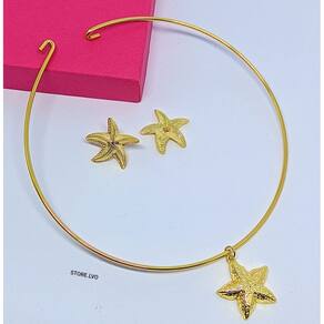 Kit Conjunto Colar e Brincos Feminino Choker aro Liso Orgânco Oval trevo Coração Liso estrela Folheado Ouro Luxo 2025 - Cor: Estrela dourado