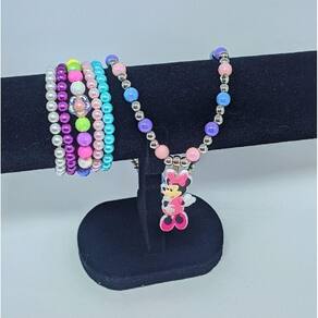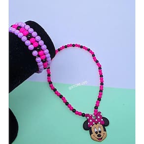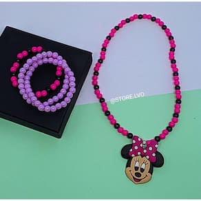 Kit Conjunto Colar e Pulseiras Infantil Meninas com Miçangas Pérolas Coloridas Princesas Minnie Sereia Monica Unicórnio - Cor: Minnie