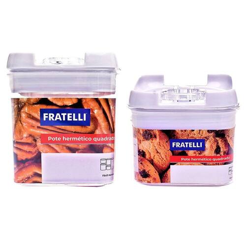 Sem mais confusões na cozinha ---------------------------------------------------------------- MEDIDAS: - 8,5 X 8 X 8 cm AxCxL ; - 11 X 8 X 8 cm AxCxL . CONTEÚDO DA EMBALAGEM: 01 Pote Hermético 280ml.E 01 Pote Hermético 400ml.