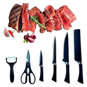 Itens inclusos: 1 Cutelo de 7 17.8cm 1 Faca de Carne 8 20cm 1 Faca para Pão 8 20cm 1 Faca para vegetais 3 9cm 1 tesoura de cozinha 13cm 1 descascador de legumes 15cm 1 estojo para guardar utensílios