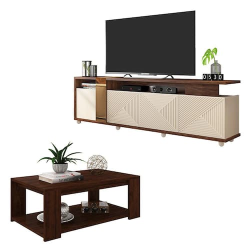 O Conjunto Rack Bancada Columbus E Mesa Mila são ideais para sua sala, deixando o ambiente mais moderno e elegante. A Bancada Columbus suporta Televisores de até 75 Polegadas além de possuir 4 portas com amplo espaço de armazenamento. A Mesa Mila composta por tampo e prateleira que suportam distribuídos até 5 kg e 10 kg, garantindo que possa sobrepor objetos de decoração, revistas, porta-retratos, flores e o que desejar para compor a decoração.