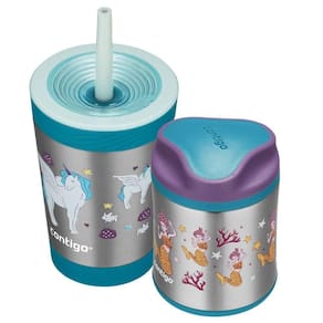 Kit Copo Térmico Kids Unicórnio 341ml + Pote Térmico Kids Sereia 284ml | Contigo Mais praticidade, e diversão nas refeições dos pequenos! Este kit exclusivo inclui um Copo Térmico com Canudo e um Pote Térmico Infantil, ambos em aço inoxidável com isolamento térmico THERMALOCK, perfeitos para conservar alimentos e bebidas na temperatura ideal por muito mais tempo. O que acompanha o kit? Copo Térmico THERMALOCK Kids Unicórnio 341ml: Recomendado para crianças a partir de 3 anos. À prova de vazamentos com válvula interna com vedação total, até mesmo de cabeça para baixo! Bebidas geladas por até 7 horas, devido ao isolamento térmico com parede dupla em aço inoxidável. Fácil de limpar, todas as partes podem ser lavadas na lava louças (prateleira superior). Portátil, cabe na maioria dos porta copos de carros. Base emborrachada, mais estabilidade e durante o uso.