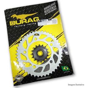 Características: Marca Durag Numero de dentes Pinhão 14 Numero de dentes Coroa 42 Passo da corrente 520 1 - Coroa de Aço SAE 1045 Específica para o modelo. 1 - Pinhão Aço SAE 8620 Especial Temperado. ( Para maior durabilidade). Recomendações: A instalação por profissional qualificado. Utilização deste produto em conjunto da corrente com retentor, para maior durabilidade e conforto. 6 meses de Garantia Kit Completo, pronto para instalação sem nenhuma adaptação ou alteração.