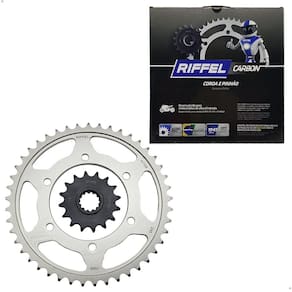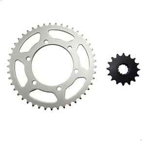 Coroa: 45 dentes, passe 525, fabricação em aço carbono 1045. Pinhão: 16 dentes, passe 525, fabricação em aço 20CrMnTi. Corrente: Não inclusa no kit.