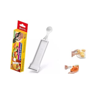 O Descascador de Legumes e Frutas e Boleador para Decorar é um utensílio 2 em 1 que irá facilitar o seu trabalho na cozinha. Com ele, você poderá descascar batatas, beterrabas, cenouras, pepinos, nabos, maçãs, mamões, laranjas e outros legumes e frutas de forma rápida e limpa. Além disso, o boleador permite que você faça decorações charmosas em suas receitas. Feito em plástico atóxico e resistente, possui lâmina em aço inox e garantia contra defeitos de fabricação. Suas dimensões aproximadas são 16 cm de comprimento e 3 cm de largura.