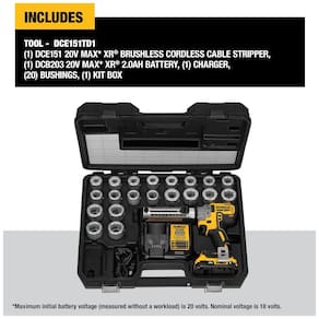 O medidor de profundidade do cortador de cabos para serviço pesado decapa consistentemente cabos de até 4 polegadas de diâmetro Tira n 6 Cortador de cabo elétrico 750 MCM Cu, Al A ferramenta de decapagem de fios com buchas de liberação rápida permite que você troque rapidamente as buchas para cada tamanho de cabo Gatilho de velocidade variável com reverso para controle de velocidade A luz LED integrada ajustável ajuda a fornecer iluminação em situações de pouca luz ou escuridão A caixa do kit vem com zenamento conveniente para ferramenta, buchas, bateria e carregador O sistema E Clutch ajuda o usuário a manter o controle da ferramenta se ela travar. Usando a bucha apropriada, o decapador de cabos funciona em cabos de cobre e alumínio THHN, XHHW, cobrindo uma faixa de tamanho de 6 AWG a 750 MCM CU e 900 MCM AL Marca: Não Informado
