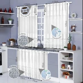 Itens inclusos: 1 cortina de pia de cozinha tulipa duas partes 1 cortina de janela de cozinha tulipa duas partes Fabricante: soul textil Material: 100% poliéster renda Cortina de janela Tamanho: 1,20x1,10x0,01cm Altura aproximada: 0,01cm Comprimento: 1,20cm Largura: 1,10cm Bandô: 0,40cm Peso: 0,250g Quantidade: duas partes de 1,10cm de largura por 1,20cm de altura Cortina de pia Tamanho: 1,50x0,80x0,01cm Altura aproximada: 0,01cm Comprimento: 0,80cm Largura: 0,75cm Bandô: 0,40cm Peso: 0,100g Quantidade: duas partes de 0,75cm de largura por 0,80cm de altura Mais detalhes: - produzido no brasil; - fabricação industrial com acabamento artesanal; - fácil de instalar; - fácil de lavar; - translúcida; - não acompanha varão; - manutenção fácil. Indicações Nossa cortina possui um apelo clássico e romântico, por esse motivo possui uma estrutura extremamente delicada. Recomendamos a compra em dobro, para que na sobreposição ele fique mais encorpada e franzida ou mais comprida e franzida, se assim desejar. Método de colocação do varão: Primeiramente com a cortina aberta identifique os furos em , dobre os 40cm referente ao bandô na altura da cortina de modo que os furos já existentes na cortina fiquem alinhados um com o outro e insira o varão nos furos. O varão não está incluso neste anúncio Recomenda-se a compra de um varão que tenha no mínimo 2,60m. O varão precisa passar 20cm da largura da janela, sendo 10 cm de cada lado. Tendo o diâmetro de 13mm, que são mais recomendados para cozinha, já é o suficiente, pois nossas cortinas são leves, mas por ela ter os furos com 4cm, nada impede de ela ser Utilizado em varões de 19mm, 28mm e até 32mm.
