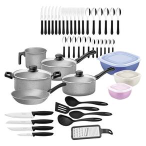 Kit Cozinha 47pçs Panelas Talheres Facas Utensílios Kit Tramontina 47 peças para Cozinha com Panelas Antiaderentes em Alumínio, Talheres, Facas e Utensílios Domésticos Tenha tudo o que você precisa para cozinhar com eficiência e praticidade com o kit Tramontina 47 peças para cozinha com panelas antiaderentes em alumínio, talheres, facas e utensílios domésticos. As panelas são feitas em alumínio com revestimento interno e externo em antiaderente, proporcionando cozimento rápido, uniforme e sem grudar. As alças e cabos em baquelite e os pegadores em nylon garantem um manuseio e confortável. As tampas de vidro temperado com borda de aço inox permitem acompanhar o preparo sem abrir as panelas. O kit inclui também utensílios de nylon, potes, facas e talheres com lâminas de aço inox e cabos de polipropileno resistentes e fáceis de limpar. Completo e funcional, é a escolha certa para quem busca praticidade e qualidade na cozinha!
