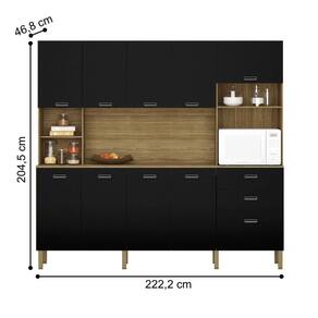 Com altura de 204,5 cm, largura de 222,2 cm e profundidade de 46,8 cm garantem que a cozinha Intense seja uma das maiores do mercado de Kits e cozinhas práticas. E o melhor: a instalação e a montagem são rápidas e fáceis, sem precisar furar a parede para fixação, o que faz toda a diferença para para você. Além disso, a cozinha prática Intense conta com 3 nichos decorativos que permitem personalizar a decoração da cozinha e guardar itens do dia a dia, deixando o ambiente ainda mais bonito e funcional. E não podemos esquecer do nicho para forno elétrico ou micro-ondas, com um espaço amplo para garantir a praticidade na hora de cozinhar e utilizar no dia a dia. Mas não é só isso. As duas amplas gavetas com corrediças telescópicas são um verdadeiro show à parte, proporcionando um deslize suave e sem esforço, sem contar que são super espaçosas e garantem a organização dos utensílios da cozinha.Os pés com regulagem, os puxadores em ABS com pintura inox e as portas em 15 mm de espessura garantem resistência e durabilidade, além de um design moderno e sofisticado.