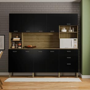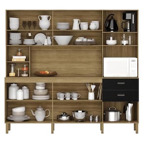 Com altura de 204,5 cm, largura de 222,2 cm e profundidade de 46,8 cm garantem que a cozinha Intense seja uma das maiores do mercado de Kits e cozinhas práticas. E o melhor: a instalação e a montagem são rápidas e fáceis, sem precisar furar a parede para fixação, o que faz toda a diferença para para você. Além disso, a cozinha prática Intense conta com 3 nichos decorativos que permitem personalizar a decoração da cozinha e guardar itens do dia a dia, deixando o ambiente ainda mais bonito e funcional. E não podemos esquecer do nicho para forno elétrico ou micro-ondas, com um espaço amplo para garantir a praticidade na hora de cozinhar e utilizar no dia a dia. Mas não é só isso. As duas amplas gavetas com corrediças telescópicas são um verdadeiro show à parte, proporcionando um deslize suave e sem esforço, sem contar que são super espaçosas e garantem a organização dos utensílios da cozinha.Os pés com regulagem, os puxadores em ABS com pintura inox e as portas em 15 mm de espessura garantem resistência e durabilidade, além de um design moderno e sofisticado.