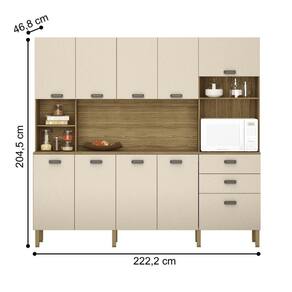 Com altura de 204,5 cm, largura de 222,2 cm e profundidade de 46,8 cm garantem que a cozinha Intense seja uma das maiores do mercado de Kits e cozinhas práticas. E o melhor: a instalação e a montagem são rápidas e fáceis, sem precisar furar a parede para fixação, o que faz toda a diferença para para você. Além disso, a cozinha prática Intense conta com 3 nichos decorativos que permitem personalizar a decoração da cozinha e guardar itens do dia a dia, deixando o ambiente ainda mais bonito e funcional. E não podemos esquecer do nicho para forno elétrico ou micro-ondas, com um espaço amplo para garantir a praticidade na hora de cozinhar e utilizar no dia a dia. Mas não é só isso. As duas amplas gavetas com corrediças telescópicas são um verdadeiro show à parte, proporcionando um deslize suave e sem esforço, sem contar que são super espaçosas e garantem a organização dos utensílios da cozinha.Os pés com regulagem, os puxadores em ABS com pintura inox e as portas em 15 mm de espessura garantem resistência e durabilidade, além de um design moderno e sofisticado.
