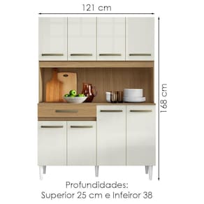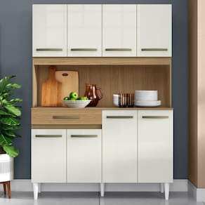 Kit Cozinha Compacta Cleo, design compacto e funcional para transformar sua sala de jantar. Estrutura em MDP (15/12 mm) e acabamento em Verniz. Possui 8 portas com puxadores em plástico, 1 prateleira interna, 1 gaveta com corrediças metálicas e 5 pés em plástico. Este produto será entregue em 1 volume.