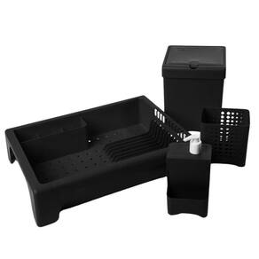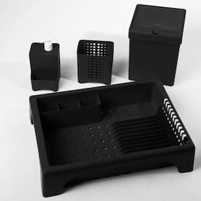 Escorredor de Louça: 45 cm C x 34 cm L x 10 cm A - Capacidade para 12 pratosPorta Talheres: 12,5 cm C x 13 cm L x 9 cm A Lixeira: 18 cm C x 18 cm L x 22 cm A - Capacidade de 5,4 litrosDispenser para Detergente e Esponja: 10 cm C x 10 cm L x 19 cm A