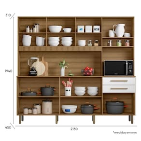 Kit Completo Madeira 2,13 Ibiza para Cozinha é o móvel completo para sua cozinha.Produzido em MDP, possui portas articuladas, gavetas corrediças metálicas e acabamento fosco.Com ótimos compartimentos internos para organizar seus utensílios, possui oito portas e duas gavetas para melhor organização e também conta com uma estrutura tradicional que irá se encaixar perfeitamente no ambiente e combinará com outros móveis.Gavetas com corrediças metálicasPuxadores com design modernoEspaço para microondas até 38LPés reguláveis