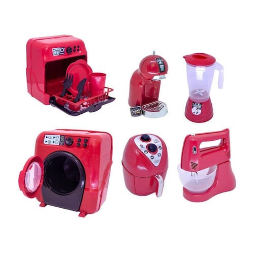 O kit vem com 12 brinquedos sendo eles airfryer, batedeira, cafeteira dolce gusto,liquidificador, máquina de lavar roupas, máquina de lavar louças e acessórios