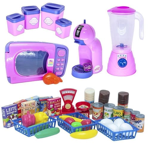 o kit vem com mercadinho completo, microondas com comidinha, potinhos de mantimentos, cafeteira com cápsula, liquidificador --------------------------------------------------------------------------------------------- - 1 caixinha de leite integral - 1 caixinha de biscoito cream cracker - 1 caixinha de bolacha de água e sal - 1 caixinha de sabão em pó - 1 caixinha de sucrilhos - 1 caixinha de balas de frutinhas - 1 pote de leite em pó - 1 pote de achocolatado - 1 pote de café - 1 latinha de ervilha - 1 latinha de milho - 1 latinha de molho - 1 latinha de refrigerante de guaraná - 1 latinha de refrigerante de laranja - 1 latinha de refrigerante de cola - 1 pimentão vermelho - 1 pimentão amarelo - 2 pepinos - 2 bananas - 2 maçãs - 1 limão - 4 ovos - 3 cestinhas - 1 balança com cestinho removível --------------------------------------------------------------------------------------------- - dimensões do microondas: 20 cm de comprimento x 10,5 largura x 12 cm altura não emite som e luz com acessório