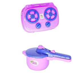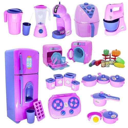 air fryer, cafeteira, batedeira, liquidificador, geladeira, jarra e copo, panelinha de pressão, fogão cooktop, balança com legumes, jogo de panelas, máquina de lavar roupa e louça, potinhos de mantimentos