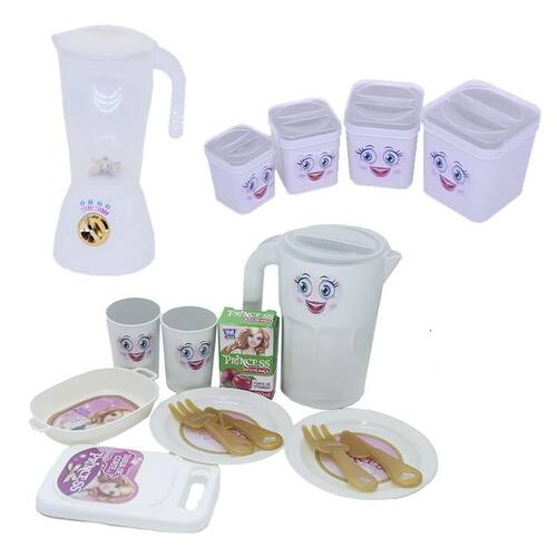 O kit vem com jogo de jantar, potinhos de mantimentos e liquidificador