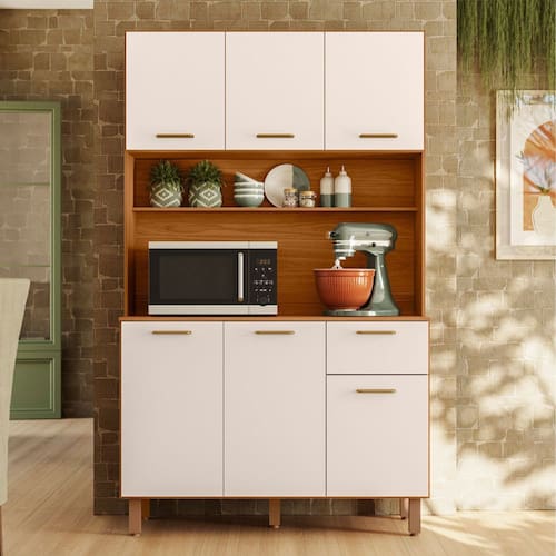 O Kit Cozinha New Livia ? a solu??o ideal para quem busca praticidade e estilo. Com 6 portas de bater e uma gaveta com corredi?as met?licas, oferece amplo espa?o de armazenamento e se destaca pelo detalhe ripado gr?fico nas portas superiores, que agrega um toque moderno ao ambiente. Al?m disso, conta com um nicho organizador decorativo -A.19 x L.108 x P.13 cm- e um espa?o perfeito sobre o balc?o -A.40 x L.108 x P.26 cm- para aparelhos e utens?lios dom?sticos.