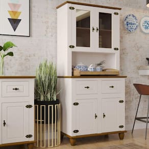 Os puxadores e dobradiças com textura de ouro envelhecido são um aceno ao charme vintage, enriquecendo o estilo retrô com um toque de luxo. Os pés dos móveis, robustos e torneados em madeira maciça, não só proporcionam uma base sólida, mas também embelezam o design com sua elegância provençal. As gavetas são especialmente projetadas para maior durabilidade. Por fim, portas, gavetas e divisórias são feitas com painéis de fibra de madeira (MDF) de 15mm, oferecendo uma construção sólida e durável.