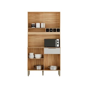 Possui gaveta com corrediça telescopica e prateleira, espaço para microondas, nicho decorativo e adega, possui puxador e pés em ABS com regulagem. Ideal para ambientes compactos e que precisam ser funcionais e organizados.