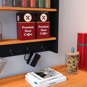 Já o Armário Amélia conta com 2 prateleiras e 5 ganchos organizadores, ideais para pendurar canecas, xícaras, panos de prato e muito mais.