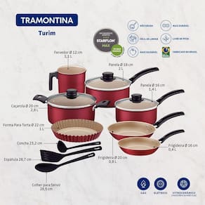 Kit Cozinha Tramontina 10 Peças Turim Em Alumínio Starflon Max Vermelho O kit cozinha Tramontina Turim em alumínio com revestimento interno e externo antiaderente Starflon Max vermelho 10 peças vai completar sua cozinha e deixá-la apta para o preparo das mais variadas receitas. Suas peças tem corpo de alumínio e são revestidas em antiaderente Starflon Max, duas características que garantem o cozimento rápido e uniforme dos alimentos, evitam que eles grudem na superfície e as tornam mais duráveis. Seus cabos e alças são em baquelite antitérmico e seus pegadores são de nylon, reduzem a propagação de calor e proporcionam um manuseio confortável e seguro. Suas panelas e sua caçarola vem com tampas de vidro temperado com borda de aço inox, que auxiliam no preparo e facilitam a visualização da parte interior. Além de tudo isso, o jogo pode ser levado à máquina de lavar louças e ainda acompanha utensílios em nylon que não danificam o antiaderente das peças e são perfeitos tanto para a hora de preparar ou de servir suas receitas! Linha/Coleção - Turim Fabricante - Tramontina Quantidade de itens - 10 Modelo - 20297776 Fonte de energia - Gás elétrico Material - Alumínio Instruções de cuidados com o produto - Seguro para lava-louças Espessura - 1,2 mm Cor - Vermelho Acabamento - Vermelho Tampa(s) - Vidro Alças e Cabos - Baquelite Quantidade de Peças - 10 É kit de fábrica - Sim Revestimento Interno - Starflon Max Revestimento Externo - Starflon Max Com revestimento antiaderente - Sim Cabo perfurado - Sim Fundo triplo - Não Composição - 1 Caçarola 20 cm 2,8 L Turim;1 Colher para Servir Easy;1 Concha para Panqueca/Molho Easy;1 Espátula Easy;1 Fervedor 12 cm 1,1 L Turim;1 Forma para Torta e Bolo 22 cm 1 L Brasil;1 Frigideira 16 cm 0,4 L Turim;1 Frigideira 20 cm 0,8 L Turim;1 Panela 16 cm 1,4 L Turim;1 Panela 18 cm 2,0 L Turim. Tampa(s) com saída de de vapor - Sim Podem ser utilizadas nos fogões - Gás, Elétrico e Vitrocerâmico Adequado para fogão de indução - Não É adequado para lava-louças - Sim Marca - Tramontina Mais Informações - Corpo de alumínio com espessura que proporciona cozimento rápido e uniforme.Revestimento interno e externo de antiaderente Starflon Max que não gruda, é fácil de limpar, mais durável e não é prejudicial à saúde, pois é livre de PFOA.Tampas de vidro temperado com borda de aço inox.Cabos, alças de baquelite antitérmico e pegadores de nylon que oferecem segurança durante o manuseio.Utensílios de nylon que permitem uso em temperaturas de até 180 C e cabos com furo passante possibilitando que sejam pendurado na sua cozinha.Podem ir à máquina de lavar louças facilitando seu dia a dia. Certificação - SGS, 003660/2018 Peso - 2.69 kg Garantia - 3 meses para vícios ou defeitos de fabricação EAN - 7891112312159 Principais Características do Produto#0 - Conjunto completo (10 peças): kit da linha Turim com 10 itens para uso diário na cozinha. Componentes incluídos - Panela Regulamentações de produtos perigosos - Não aplicável Principais Características do Produto#2 - Material + antiaderente: peças em alumínio com revestimento interno e externo antiaderente Starflon Max Comprimento da embalagem - 50 cm Largura da embalagem - 30 cm Origem - Nacional NBM/NCM - 76151000 Altura da embalagem - 20 cm Peso da embalagem - 4000 g Tipo da embalagem - Com embalagem adicional Tempo de Garantia (Meses) - 3 Principais Características do Produto#1 - Segurança e acabamento: cabos/alças/pegadores em baquelite e nylon e tampas de vidro temperado com borda de aço inox Baterias são necessárias? - Não Certificação de teste externa - Inmetro Número de caixas - 1 Número do modelo - 20297776