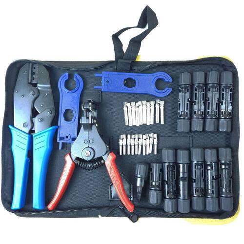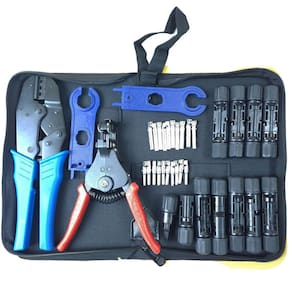 - 1 crimpador para conector MC4 com mandíbula para cabos de 2,5mm2, 4mm2 e 6mms, comprimento 23cm, peso 550g, material aço carbono, modelo LY-2546B (Hand Crimping Tools). - 10 pares de conectores MC4 com pinos - 1 decapador especial para cabo solar de 2,5mm2, 4mm2 e 6mm2, material aço carbono, comprimento 17cm, modelo WX700B. - 1 bolsa com zíper, material Oxford, medidas: 26 x 16 x 5 cm. - 1 par de chave esticadora para conector MC4