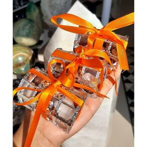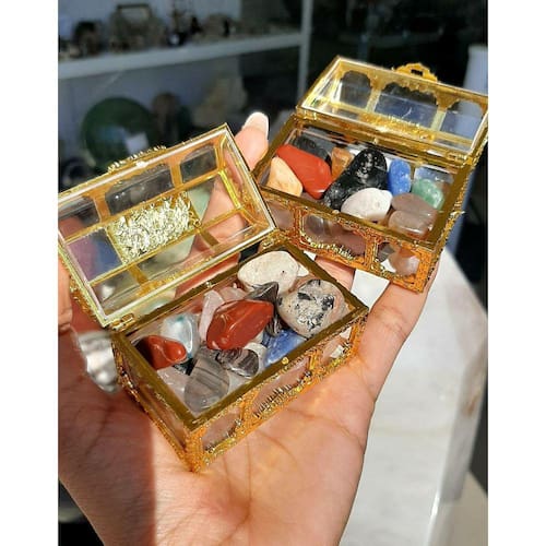 Kit composto por: BOX Dourado, 80 gramas de pedras mistas e fita de cetim.