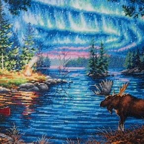 Dimensions Kit de ponto cruz contado Gold Collection, Noite do Norte, 16 unidades Dove Grey Aida, 40,6 cm x 28 cm, multicolorido, grande - O kit de ponto cruz avançado Northern Night inclui Aida cinza pomba, 16 unidades, fio de algodão pré-diverso, agulha e instruções fáceis. - O kit completo de ponto cruz Northern Lights mede 40 cm x 28 cm. - Este padrão avançado de ponto cruz apresenta uma vista deslumbrante da aurora boreal sobre um acampamento. - Projetado especificamente para costureiros experientes, este ponto cruz encantador usa pontos completos e meio para criar detalhes magníficos. - Enquadre e pendure seu ponto de cruz completo da Northern Lights para uma obra de arte de parede de tirar o fôlego.