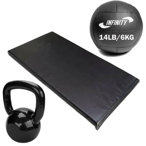Kit composto por: - colchonete em espuma 90x45x2cm - kettlebell emborrachado 12 kg - wall ball 6 kg