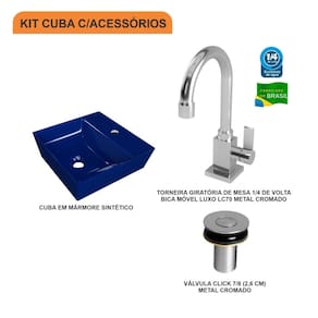 Sobre o ProdutoKit Cuba AQ33 C/Torneira Luxo 1195 + Válvula Click 1''B (2,6cm) AmareloDescrição do ProdutoO Kit KTCAAQ330W.AM.LC70.V02 é uma combinação perfeita da Cuba de Apoio CAAQ330W.AM com acessórios complementares, prontos para instalação no seu lavabo ou móvel de banheiro. Ele conta com 1 Cuba de Apoio Angular Quadrada Volcano 33X30cm Amarelo + 1 Torneira De Mesa Classic Luxo 1/4 De Volta 1195 C70 + 1 Válvula P/Lavatório Click Up Interno 1" (2,6cm) V02 Metal Cromado + 0+ 0+ 0 , todos compatíveis e prontos para instalação.Itens Inclusos:1 Cuba de Apoio + 1 Torneira de mesa baixa + 1 Válvula de Escoamento Clik Up Informações Logísticas:Vol.01 Comp.: 37,5cm Prof.: 37,5cm Alt.: 17cm Peso Bruto: 6,118Kg Observações:Não acompanha acessórios decorativos. Imagens meramente ilustrativas.Informações Técnicas / CaracterísticasCuba de Apoio Angular Quadrada Volcano 33X30cm Amarelo Cor: Amarelo Marca: Compace Modelo: CDQD330 Linha: Conect Formato: Angular Quadrada Tipo de Cuba: Apoio Material: Mármore Sintético Acabamento: Hard Lacca PU Escala de Brilho: Brilho Possui Ladrão: Não Possui Furação para Torneira: Sim Diâmetro do Furo para Torneira: (32mm) - DN 32 Diâmetro do Furo para Válvula: (40mm) - DN 40 Comprimento: 33cm Largura: 30cm Altura: 10cm Peso Líq.: 4,6Kg Recomendações de Uso, Manutenção e Limpeza: Utilize flanela seca ou pano macio, levemente umedecido com água. Evite contato com produtos químicos e abrasivos (solventes, thinner, acetona etc) e não utilize nenhum tipo de esponja de aço. Para maior brilho, recomendamos a utilização de cera automotiva n 2. Necessita de Montagem: Sim / Acompanha Manual de Montagem Complexidade da Montagem: Média: pode ser montado por mais de uma pessoa e/ou necessite de maior conhecimento para montagem. Garantia: 6 mesesTorneira De Mesa Classic Luxo 1/4 De Volta 1195 C70 Cor: Cromado Marca: Compace Modelo: CL1195 Linha: Classic Tipo de Torneira: Convencional Local: Lavatório Tipo de Instalação: De Mesa Acabamento: Camada de Cromo Salt Spray. Possui alta resistência contra corrosão, maresia, oxidação e descascamento. Material: Liga de Cobre (Bronze e Latão), Inox, Zamac, Elastômeros e Plásticos de Engenharia Possui Arejador Sim Tipo de Bica: Móvel Pressão Máxima: 40 m.c.a. Pressão Mínima: 2 m.c.a. Temperatura da Água Indicada: Mín.: 5 Celsius / Máx.: 70 Celsius Bitola do Cano: 1/2" Altura Total: 23cm Altura da base até a saída da água: 15cm Profundidade da saída da água até o final do cano: 14cm Peso Líq.: 0,48Kg Recomendações de Uso, Manutenção e Limpeza: Limpar apenas com pano macio e sabão neutro. Não usar produtos abrasivos como sapólio, palha de aço e produtos químicos. Garantia: 5 anosVálvula P/Lavatório Click Up Interno 1" (2,6cm) V02 Metal Cromado Cor: Cromado Marca: Compace Modelo: CO1612V02 Linha: Complementos Tipo: Click Local: Lavatório Acabamento: Cromado Material: Zamak, Elastômeros e Plásticos de Engenharia. Bitola do Cano: 1" Possui Ladrão: Não Altura: 7cm Diâmetro: 5,5cm Altura Total: 8cm Peso Líq.: 0,11Kg Recomendações de Uso, Manutenção e Limpeza: Limpar apenas com pano macio e sabão neutro. Não usar produtos abrasivos como sapólio, palha de aço e produtos químicos. Necessita de Montagem: Sim Complexidade da Montagem: Média: pode ser montado por mais de uma pessoa e/ou necessite de maior conhecimento para montagem. Garantia: 5 anos