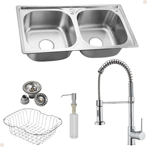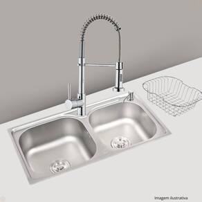 Itens Inclusos 1 Cuba Gourmet Dupla 1 Sifão 1 Cesto escorredor 1 Dosador de detergente 300 ml 1 Válvula de escoamento 1 Torneira 2 Mangueiras conectoras Acessórios de fixação