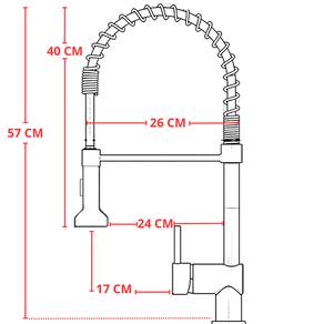 Especificações da Torneira: Material: Metal ( Aço inox escovado ) e Plástico ABS ( Chuveirinho) Acabamento: Escovado Saída de água com acionamento de ducha. Altura: 57 cm Largura: 26 cm Extensão da mangueira: 70 cm Sistema: Monocomando quente/frio Características: corpo com giro de 360º, ducha spray Furação da bancada: 35mm (milímetros)