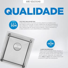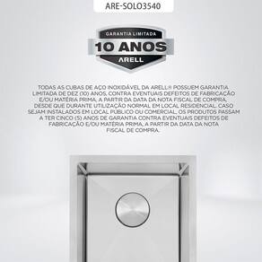 Todas as cubas de aço inoxidável da Arell possuem garantia limitada de dez (10) anos, contra eventuais s de fabricação e/ou matéria prima, a partir da data da de compra, desde que durante utilização normal em local residencial. Caso sejam instalados em local público ou comercial, os produtos passam a ter cinco (5) anos de garantia contra eventuais s de fabricação e/ou matéria prima, a partir da data da nota
