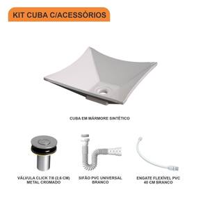 Sobre o ProdutoKit Cuba L30 C/Válvula Click 1''B (2,6cm) + Sifão Pvc + Flexível AmareloDescrição do ProdutoO Kit KTCALX300W.AM.AP02 é uma combinação perfeita da Cuba de Apoio CALX300W.AM com acessórios complementares, prontos para instalação no seu lavabo ou móvel de banheiro. Ele conta com 1 Cuba de Apoio Folha L30 29,8X29,8cm Amarelo + 1 Válvula P/Lavatório Click Up Interno 1 (2,6cm) V02 Metal Cromado + 1 Sifão Pvc Universal Branco + 1 Engate Flexível Pvc Branco 40cm + 0+ 0 , todos compatíveis e prontos para instalação.Itens Inclusos:1 Cuba de Apoio + 1 Válvula de Escoamento Clik Up + 1 Sifão PVC Universal Branco + 1 Engate Flexível 40cm Informações Logísticas:Vol.01 - Comp.: 33cm - Prof.: 33cm - Alt.: 17cm - Peso Bruto: 3,415Kg Observações:Não acompanha acessórios decorativos. Imagens meramente ilustrativas.Informações Técnicas / CaracterísticasCuba de Apoio Folha L30 29,8X29,8cm Amarelo- Cor: Amarelo- Marca: Compace- Modelo: CALX300- Linha: Lux- Formato: Folha- Tipo de Cuba: Apoio- Material: Mármore Sintético- Acabamento: Hard Lacca PU- Escala de Brilho: Brilho- Possui Ladrão: Não- Possui Furação para Torneira: Não - Diâmetro do Furo para Válvula: (40mm) - DN 40 - Comprimento: 29,8cm- Largura: 29,8cm- Altura: 11,5cm - Peso Líq.: 2,33Kg- Recomendações de Uso, Manutenção e Limpeza: Utilize flanela seca ou pano macio, levemente umedecido com água. Evite contato com produtos químicos e abrasivos (solventes, thinner, acetona etc) e não utilize nenhum tipo de esponja de aço. Para maior brilho, recomendamos a utilização de cera automotiva n 2.- Necessita de Montagem: Sim / Acompanha Manual de Montagem- Complexidade da Montagem: Média: pode ser montado por mais de uma pessoa e/ou necessite de maior conhecimento para montagem.- Garantia: 6 mesesVálvula P/Lavatório Click Up Interno 1 (2,6cm) V02 Metal Cromado- Cor: Cromado- Marca: Compace- Modelo: CO1612V02- Linha: Complementos- Tipo: Click- Local: Lavatório- Acabamento: Cromado- Material: Zamak, Elastômeros e Plásticos de Engenharia.- Bitola do Cano: 1- Possui Ladrão: Não - Altura: 7cm- Diâmetro: 5,5cm - Altura Total: 8cm- Peso Líq.: 0,14Kg- Recomendações de Uso, Manutenção e Limpeza: Limpar apenas com pano macio e sabão neutro. Não usar produtos abrasivos como sapólio, palha de aço e produtos químicos.- Necessita de Montagem: Sim- Complexidade da Montagem: Média: pode ser montado por mais de uma pessoa e/ou necessite de maior conhecimento para montagem.- Garantia: 5 anosSifão Pvc Universal Branco- Cor: Branco- Marca: Compace- Modelo: SPVC- Linha: Complementos- Tipo: Flexível- Local: Multiuso- Acabamento: PVC- Material: PVC- Bitola do Cano: Universal - Temperatura da Água Indicada: Mín.: 0 Celsius / Máx.: 90 Celsius - Comprimento: 29cm - Diâmetro: 5cm- Comprimento Total: 71cm - Peso Líq.: 0,1Kg- Recomendações de Uso, Manutenção e Limpeza: Limpar apenas com pano macio e sabão neutro. Não usar produtos abrasivos como sapólio, palha de aço e produtos químicos.- Necessita de Montagem: Sim- Complexidade da Montagem: Média: pode ser montado por mais de uma pessoa e/ou necessite de maior conhecimento para montagem.- Garantia: 01 anoEngate Flexível Pvc Branco 40cm- Cor: Branco- Marca: Compace- Modelo: FLEX- Linha: Complementos- Tipo: Flexível- Local: Multiuso- Acabamento: PVC- Material: PVC- Bitola do Cano: Universal - Pressão Indicada: 40 m.c.a.- Temperatura da Água Indicada: Fria - Comprimento: 40cm - Diâmetro: 2cm - Peso Líq.: 0,08Kg- Recomendações de Uso, Manutenção e Limpeza: Limpar apenas com pano macio e sabão neutro. Não usar produtos abrasivos como sapólio, palha de aço e produtos químicos.- Necessita de Montagem: Sim- Complexidade da Montagem: Média: pode ser montado por mais de uma pessoa e/ou necessite de maior conhecimento para montagem.- Garantia: 01 ano Formato: Folha | Tipo de Cuba: Apoio | Material: Mármore Sintético | Acabamento: Hard Lacca PU Fosco | Escala de Brilho: Fosco | Possui Furação para Torneira: Não | Diâmetro do Furo para Torneira: 0 | Diâmetro do Furo para Válvula: (40mm) - DN 40 | Itens Inclusos: 1 Cuba de Apoio + 1 Válvula de Escoamento Clik Up + 1 Sifão PVC Universal Branco + 1 Engate Flexível 40cm | Limite de unidades por venda: É possível comprar até 1 unidade por venda. | Quantidade máxima de pedido: 1 | Baterias são necessárias?: false Cor: Bege