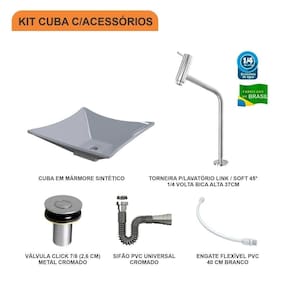 Sobre o ProdutoKit Cuba L34 C/Torneira Link 1062 Metal + Válvula Click 1''B (2,6cm) + Sifão Cromado + Flexível AmareloDescrição do ProdutoO Kit KTCALX340W.AM.1062.AC02 é uma combinação perfeita da Cuba de Apoio CALX340W.AM com acessórios complementares, prontos para instalação no seu lavabo ou móvel de banheiro. Ele conta com 1 Cuba de Apoio Folha L34 34,5X34,5cm Amarelo + 1 Torneira P/Lavatório Pratika 45 1/4 Volta Bica Alta 36cm Metal Cromado + 1 Válvula P/Lavatório Click Up Interno 1 (2,6cm) V02 Metal Cromado + 1 Sifão Pvc Universal Cromado + 1 Engate Flexível Pvc Branco 40cm + 0 , todos compatíveis e prontos para instalação.Itens Inclusos:1 Cuba de Apoio + 1 Torneira de mesa alta + 1 Válvula de Escoamento Clik Up + 1 Sifão PVC Universal Cromado + 1 Engate Flexível 40cm Informações Logísticas:Vol.01 - Comp.: 40cm - Prof.: 40cm - Alt.: 15,5cm - Peso Bruto: 3,99Kg Observações:Não acompanha acessórios decorativos. Imagens meramente ilustrativas.Informações Técnicas / CaracterísticasCuba de Apoio Folha L34 34,5X34,5cm Amarelo- Cor: Amarelo- Marca: Compace- Modelo: CALX340- Linha: Lux- Formato: Folha- Tipo de Cuba: Apoio- Material: Mármore Sintético- Acabamento: Hard Lacca PU- Escala de Brilho: Brilho- Possui Ladrão: Não- Possui Furação para Torneira: Não - Diâmetro do Furo para Válvula: (40mm) - DN 40 - Comprimento: 34,5cm- Largura: 34,5cm- Altura: 11,5cm - Peso Líq.: 2,88Kg- Recomendações de Uso, Manutenção e Limpeza: Utilize flanela seca ou pano macio, levemente umedecido com água. Evite contato com produtos químicos e abrasivos (solventes, thinner, acetona etc) e não utilize nenhum tipo de esponja de aço. Para maior brilho, recomendamos a utilização de cera automotiva n 2.- Necessita de Montagem: Sim / Acompanha Manual de Montagem- Complexidade da Montagem: Média: pode ser montado por mais de uma pessoa e/ou necessite de maior conhecimento para montagem.- Garantia: 6 mesesTorneira P/Lavatório Pratika 45 1/4 Volta Bica Alta 36cm Metal Cromado- Cor: Cromado- Marca: Compace- Modelo: 1062- Linha: Pratika- Tipo de Torneira: Convencional- Local: Lavatório- Tipo de Instalação: De Mesa- Acabamento: Camada de Cromo Salt Spray. Possui alta resistência contra corrosão, maresia, oxidação e descascamento.- Material: Liga de Cobre (Bronze e Latão), Inox, Zamac, Elastômeros e Plásticos de Engenharia- Possui Arejador Sim- Tipo de Bica: Fixa- Pressão Máxima: 40 m.c.a.- Pressão Mínima: 2 m.c.a.- Temperatura da Água Indicada: Mín.: 5 Celsius / Máx.: 70 Celsius- Bitola do Cano: 1/2 - Altura Total: 36cm- Altura da base até a saída da água: 28cm- Profundidade da saída da água até o final do cano: 14cm- Peso Líq.: 0,35Kg- Recomendações de Uso, Manutenção e Limpeza: Limpar apenas com pano macio e sabão neutro. Não usar produtos abrasivos como sapólio, palha de aço e produtos químicos.- Garantia: 5 anosVálvula P/Lavatório Click Up Interno 1 (2,6cm) V02 Metal Cromado- Cor: Cromado- Marca: Compace- Modelo: CO1612V02- Linha: Complementos- Tipo: Click- Local: Lavatório- Acabamento: Cromado- Material: Zamak, Elastômeros e Plásticos de Engenharia.- Bitola do Cano: 1- Possui Ladrão: Não - Altura: 7cm- Diâmetro: 5,5cm - Altura Total: 8cm- Peso Líq.: 0,14Kg- Recomendações de Uso, Manutenção e Limpeza: Limpar apenas com pano macio e sabão neutro. Não usar produtos abrasivos como sapólio, palha de aço e produtos químicos.- Necessita de Montagem: Sim- Complexidade da Montagem: Média: pode ser montado por mais de uma pessoa e/ou necessite de maior conhecimento para montagem.- Garantia: 5 anosSifão Pvc Universal Cromado- Cor: Cromado- Marca: Compace- Modelo: SCRO- Linha: Complementos- Tipo: Flexível- Local: Multiuso- Acabamento: Cromado- Material: PVC- Bitola do Cano: Universal - Temperatura da Água Indicada: Mín.: 0 Celsius / Máx.: 90 Celsius - Comprimento: 29cm - Diâmetro: 5cm- Comprimento Total: 71cm - Peso Líq.: 0,1Kg- Recomendações de Uso, Manutenção e Limpeza: Limpar apenas com pano macio e sabão neutro. Não usar produtos abrasivos como sapólio, palha de aço e produtos químicos.- Necessita de Montagem: Sim- Complexidade da Montagem: Média: pode ser montado por mais de uma pessoa e/ou necessite de maior conhecimento para montagem.- Garantia: 01 anoEngate Flexível Pvc Branco 40cm- Cor: Branco- Marca: Compace- Modelo: FLEX- Linha: Complementos- Tipo: Flexível- Local: Multiuso- Acabamento: PVC- Material: PVC- Bitola do Cano: Universal - Pressão Indicada: 40 m.c.a.- Temperatura da Água Indicada: Fria - Comprimento: 40cm - Diâmetro: 2cm - Peso Líq.: 0,08Kg- Recomendações de Uso, Manutenção e Limpeza: Limpar apenas com pano macio e sabão neutro. Não usar produtos abrasivos como sapólio, palha de aço e produtos químicos.- Necessita de Montagem: Sim- Complexidade da Montagem: Média: pode ser montado por mais de uma pessoa e/ou necessite de maior conhecimento para montagem.- Garantia: 01 ano Formato: Folha | Tipo de Cuba: Apoio | Material: Mármore Sintético | Acabamento: Hard Lacca PU Fosco | Escala de Brilho: Fosco | Possui Furação para Torneira: Não | Diâmetro do Furo para Torneira: 0 | Diâmetro do Furo para Válvula: (40mm) - DN 40 | Itens Inclusos: 1 Cuba de Apoio + 1 Torneira de mesa alta + 1 Válvula de Escoamento Clik Up + 1 Sifão PVC Universal Cromado + 1 Engate Flexível 40cm | Limite de unidades por venda: É possível comprar até 1 unidade por venda. | Quantidade máxima de pedido: 1 | Baterias são necessárias?: false Cor: Cinza
