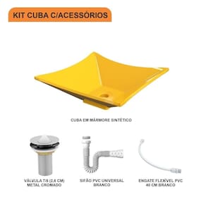Sobre o ProdutoKit Cuba L34 C/Válvula 1'' (2,6cm) + Sifão Pvc + Flexível AmareloDescrição do ProdutoO Kit KTCALX340W.AM.AP01 é uma combinação perfeita da Cuba de Apoio CALX340W.AM com acessórios complementares, prontos para instalação no seu lavabo ou móvel de banheiro. Ele conta com 1 Cuba de Apoio Folha L34 34,5X34,5cm Amarelo + 1 Válvula P/Lavatório 1 (2,6cm) V01 Metal Cromado + 1 Sifão Pvc Universal Branco + 1 Engate Flexível Pvc Branco 40cm + 0+ 0 , todos compatíveis e prontos para instalação.Itens Inclusos:1 Cuba de Apoio + 1 Válvula de Escoamento + 1 Sifão PVC Universal Branco + 1 Engate Flexível 40cm Informações Logísticas:Vol.01 - Comp.: 40cm - Prof.: 40cm - Alt.: 15,5cm - Peso Bruto: 3,6Kg Observações:Não acompanha acessórios decorativos. Imagens meramente ilustrativas.Informações Técnicas / CaracterísticasCuba de Apoio Folha L34 34,5X34,5cm Amarelo- Cor: Amarelo- Marca: Compace- Modelo: CALX340- Linha: Lux- Formato: Folha- Tipo de Cuba: Apoio- Material: Mármore Sintético- Acabamento: Hard Lacca PU- Escala de Brilho: Brilho- Possui Ladrão: Não- Possui Furação para Torneira: Não - Diâmetro do Furo para Válvula: (40mm) - DN 40 - Comprimento: 34,5cm- Largura: 34,5cm- Altura: 11,5cm - Peso Líq.: 2,88Kg- Recomendações de Uso, Manutenção e Limpeza: Utilize flanela seca ou pano macio, levemente umedecido com água. Evite contato com produtos químicos e abrasivos (solventes, thinner, acetona etc) e não utilize nenhum tipo de esponja de aço. Para maior brilho, recomendamos a utilização de cera automotiva n 2.- Necessita de Montagem: Sim / Acompanha Manual de Montagem- Complexidade da Montagem: Média: pode ser montado por mais de uma pessoa e/ou necessite de maior conhecimento para montagem.- Garantia: 6 mesesVálvula P/Lavatório 1 (2,6cm) V01 Metal Cromado- Cor: Cromado- Marca: Compace- Modelo: CO1603V01- Linha: Complementos- Tipo: Convencional- Local: Lavatório- Acabamento: Cromado- Material: Zamak, Elastômeros e Plásticos de Engenharia.- Bitola do Cano: 1- Possui Ladrão: Não - Altura: 7cm- Diâmetro: 5,5cm - Altura Total: 7,5cm- Peso Líq.: 0,1Kg- Recomendações de Uso, Manutenção e Limpeza: Limpar apenas com pano macio e sabão neutro. Não usar produtos abrasivos como sapólio, palha de aço e produtos químicos.- Necessita de Montagem: Sim- Complexidade da Montagem: Média: pode ser montado por mais de uma pessoa e/ou necessite de maior conhecimento para montagem.- Garantia: 5 anosSifão Pvc Universal Branco- Cor: Branco- Marca: Compace- Modelo: SPVC- Linha: Complementos- Tipo: Flexível- Local: Multiuso- Acabamento: PVC- Material: PVC- Bitola do Cano: Universal - Temperatura da Água Indicada: Mín.: 0 Celsius / Máx.: 90 Celsius - Comprimento: 29cm - Diâmetro: 5cm- Comprimento Total: 71cm - Peso Líq.: 0,1Kg- Recomendações de Uso, Manutenção e Limpeza: Limpar apenas com pano macio e sabão neutro. Não usar produtos abrasivos como sapólio, palha de aço e produtos químicos.- Necessita de Montagem: Sim- Complexidade da Montagem: Média: pode ser montado por mais de uma pessoa e/ou necessite de maior conhecimento para montagem.- Garantia: 01 anoEngate Flexível Pvc Branco 40cm- Cor: Branco- Marca: Compace- Modelo: FLEX- Linha: Complementos- Tipo: Flexível- Local: Multiuso- Acabamento: PVC- Material: PVC- Bitola do Cano: Universal - Pressão Indicada: 40 m.c.a.- Temperatura da Água Indicada: Fria - Comprimento: 40cm - Diâmetro: 2cm - Peso Líq.: 0,08Kg- Recomendações de Uso, Manutenção e Limpeza: Limpar apenas com pano macio e sabão neutro. Não usar produtos abrasivos como sapólio, palha de aço e produtos químicos.- Necessita de Montagem: Sim- Complexidade da Montagem: Média: pode ser montado por mais de uma pessoa e/ou necessite de maior conhecimento para montagem.- Garantia: 01 ano Formato: Folha | Tipo de Cuba: Apoio | Material: Mármore Sintético | Acabamento: Hard Lacca PU Fosco | Escala de Brilho: Fosco | Possui Furação para Torneira: Não | Diâmetro do Furo para Torneira: 0 | Diâmetro do Furo para Válvula: (40mm) - DN 40 | Itens Inclusos: 1 Cuba de Apoio + 1 Válvula de Escoamento + 1 Sifão PVC Universal Branco + 1 Engate Flexível 40cm | Limite de unidades por venda: É possível comprar até 1 unidade por venda. | Quantidade máxima de pedido: 1 | Baterias são necessárias?: false Cor: Amarelo