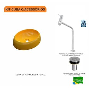 O Kit KTCAOV390W.CL.1062.V02 é uma combinação perfeita da Cuba de Apoio CAOV390W.CL com acessórios complementares, prontos para instalação no seu lavabo ou móvel de banheiro. Ele conta com 1 Cuba de Apoio Oval Capri 39,5X30cm Colorida e 1 Torneira para Lavatório Pratika 45° 1/4 Volta Bica Alta 36cm Metal Cromado e 1 Válvula para Lavatório Click Up Interno 1 Polegada (2,6cm) V02 Metal Cromado, todos compatíveis e prontos para instalação. Acompanha Manual de Instalação: Sim Acompanha Sifão: Não Acompanha Torneira: Sim Altura: 10 cm Altura da Torneira: 36 cm Comprimento: 39 cm Cor: Amarelo Cor do Produto: Amarelo Diâmetro para válvula: 32 mm Itens Inclusos: 1 Cuba de Apoio, 1 Torneira de mesa alta, 1 Válvula de Escoamento Clik Up Largura: 30 cm Linha ou Coleção: Plus Manual de Montagem e Instalação: https://product-hub-prd.madeiramadeira.com.br/619466/documents/c38a634e-cc3c-484e-9d3e-3e5994dd68d2645207ktcaov390wcl1062v02.rar Material da Torneira: Latão Material Principal: Mármore Sintético Origem do Produto: Nacional Peso: 4 kg Possui furação para torneira: Não Possui ladrão: Não Pressão Máxima da Torneira: 40 mca Pressão Mínima da Torneira: 2 mca Recomendações de Uso, Manutenção e Limpeza: Utilize flanela seca ou pano macio, levemente umedecido com água. Evite contato com produtos químicos e abrasivos (solventes, thinner, acetona etc) e não utilize nenhum tipo de esponja de aço. Para maior brilho, recomendamos a utilização de cera automotiva n° 2. Tipo de Acionamento da Torneira: 1/4 de volta Válvula oculta: Não Ean: 7908388173213