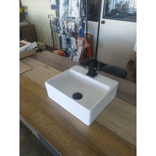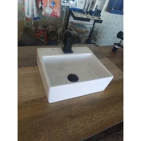 Cuba de Sobrepor em louça branca brilhosa com 29,5 cm de largura, 34 cm de comprimento e 12,5 cm de altura. Acompanha torneira agua fria 1/4 de volta Rainha em Metal preto fosco e válvula de click metal preto fosco
