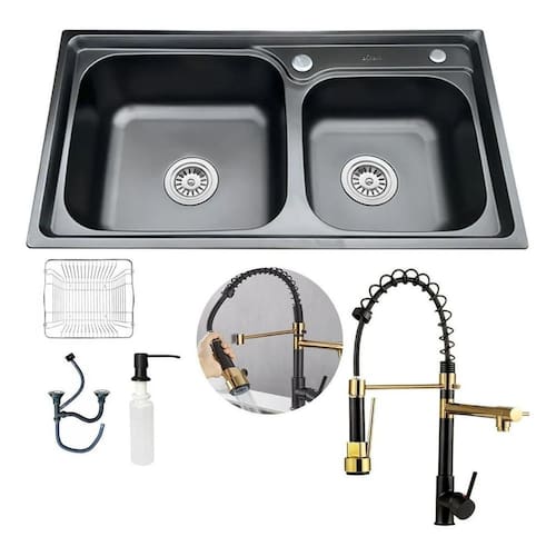 Cuba cozinha gourmet pia dupla preta + torneira gourmet 2 saídas preta e dourada Cuba dupla preta cozinha gourmet Especificações técnicas Marca: brinovar Cor: preto Acabamento: acetinado Modelo: dupla Material: aço inoxidável 201 Espessura: 3mm Indicação: cozinha, espaços gourmet, ilhas e churrasqueiras Aplicação: embutir ou sobrepor Medidas total da cuba: 78 c x 43 l x 20 a cm Capacidade total: 39 litros Medidas internas cuba grande: 37 c x 36 l x 18 a cm Capacidade: 24 litros Medidas internas cuba pequena: 30 c x 30 l x 16,5 a cm Capacidade: 15 litros Diâmetro furo para torneira: 35mm lado esquerdo Diâmetro furo para dispenser: 28mm lado direito Posição da válvula: centralizada Furo para válvula de 4 1 2 '' Válvula escape - ladrão: sim Anti-ruído: sim fundo Aceita triturador: sim Acompanha acessórios: sim Sifão: sim : 90 dias Torneira gourmet 2 saídas preta e dourada brinovar Especificações técnicas: Marca: brinovar Cor: preto e dourado Acabamento: preto fosco e dourado cromado brilhante Material: aço inox 304 Modelo: 2 saídas de bancada Indicação: cozinha - espaços gourmet - ilhas - churrasqueiras Instalação: bancada - pia Sistema: monocomando Bica: móvel e giratória com rotação 360 graus Quantidade de saídas de água: 2, torneira ducha e torneira para filtro filtro não incluso Jato de água: bica giratória aerado e bica móvel ducha gourmet com acionamento através do botão Arejador: sim Altura: 51 cm Largura: 4,5 cm Comprimento total: 26,5 cm Temperatura mínima da água: 5 celcius Temperatura máxima da água: 75 celcius Utilização somente com água fria: sim, necessário a utilização de adaptador 't' não incluso Aquecedor compatível com a torneira: elétrico, solar e gás não incluso Pressão mínima da água: 3mca metros de coluna dágua Pressão máxima da água: 40mca metros de coluna dágua Pressão ideal da água: acima de 5mca metros de coluna dágua Cartucho: cartucho cerâmico de alta durabilidade 500.000 ciclos Perfuração da bancada: 3,5 cm Rosca: 3 cm : 90 dias Atenção: o produto não acompanha filtro, apenas a torneira para o filtro Cuidados: Não use palha de aço, produtos químicos, não usar ácido muriático, água sanitária ou qualquer outro solvente para a limpeza. Limpe periodicamente o seu produto apenas com um pano macio, água e sabão neutro. Para manter o brilho do seu produto recomendamos o uso da pasta para polir e remover manchas em superfícies de aço inoxidável. Itens inclusos: Torneira monocomando 2 saídas Mangueira flexível de aço trançado 50cm para ligação de água quente e fria Sistema de fixação Anéis de vedação Cuba projetada para aplicação sobreposta ou embutida. Dosador de sabão de 300ml com sistema recarrega fácil. Não é necessário retirar o reservatório para reabastecê-lo. Cesto escorredor Válvula 4 1 2 totalmente compatíveis com o uso de trituradores elétricos . Válvula e tubulação do ladrão Sifão Marca: Não Informado