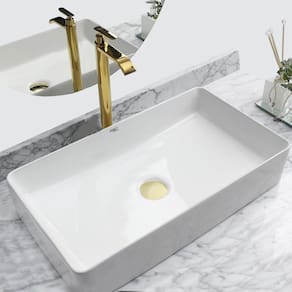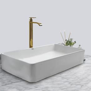 Kit Cuba Pia Louça Cerâmica Banheiro Com Torn E Vál Dourada 2 Decore seu banheiro com este kit de sobrepor contendo cuba, torneira e válvula que não é apenas uma tendência no mundo do desenho, mas também lhe dará espaço suficiente em seus lados para colocar itens de higiene pessoal.