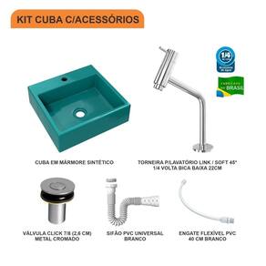 Sobre o ProdutoKit Cuba Q395 C/Torneira Pratika 1060 Metal + Válvula Click 1''B (2,6cm) + Sifão Pvc + Flexível AmareloDescrição do ProdutoO Kit KTCAQD395W.AM.1060.AP02 é uma combinação perfeita da Cuba de Apoio CAQD395W.AM com acessórios complementares, prontos para instalação no seu lavabo ou móvel de banheiro. Ele conta com 1 Cuba de Apoio Quadrada Veneza 39X37cm Amarelo + 1 Torneira P/Lavatório Pratika 45 1/4 Volta Bica Baixa 22cm Metal Cromado + 1 Válvula P/Lavatório Click Up Interno 1" (2,6cm) V02 Metal Cromado + 1 Sifão Pvc Universal Branco + 1 Engate Flexível Pvc Branco 40cm + 0 , todos compatíveis e prontos para instalação.Itens Inclusos:1 Cuba de Apoio + 1 Torneira de mesa baixa + 1 Válvula de Escoamento Clik Up + 1 Sifão PVC Universal Branco + 1 Engate Flexível 40cm Informações Logísticas:Vol.01 Comp.: 47cm Prof.: 44,5cm Alt.: 15cm Peso Bruto: 8,83Kg Observações:Não acompanha acessórios decorativos. Imagens meramente ilustrativas.Informações Técnicas / CaracterísticasCuba de Apoio Quadrada Veneza 39X37cm Amarelo Cor: Amarelo Marca: Compace Modelo: CAQD395 Linha: Conect Formato: Quadrada Tipo de Cuba: Apoio Material: Mármore Sintético Acabamento: Hard Lacca PU Escala de Brilho: Brilho Possui Ladrão: Não Possui Furação para Torneira: Sim Diâmetro do Furo para Torneira: (32mm) - DN 32 Diâmetro do Furo para Válvula: (40mm) - DN 40 Comprimento: 39cm Largura: 37cm Altura: 11,5cm Peso Líq.: 7,7Kg Recomendações de Uso, Manutenção e Limpeza: Utilize flanela seca ou pano macio, levemente umedecido com água. Evite contato com produtos químicos e abrasivos (solventes, thinner, acetona etc) e não utilize nenhum tipo de esponja de aço. Para maior brilho, recomendamos a utilização de cera automotiva n 2. Necessita de Montagem: Sim / Acompanha Manual de Montagem Complexidade da Montagem: Média: pode ser montado por mais de uma pessoa e/ou necessite de maior conhecimento para montagem. Garantia: 6 mesesTorneira P/Lavatório Pratika 45 1/4 Volta Bica Baixa 22cm Metal Cromado Cor: Cromado Marca: Compace Modelo: 1060 Linha: Pratika Tipo de Torneira: Convencional Local: Lavatório Tipo de Instalação: De Mesa Acabamento: Camada de Cromo Salt Spray. Possui alta resistência contra corrosão, maresia, oxidação e descascamento. Material: Liga de Cobre (Bronze e Latão), Inox, Zamac, Elastômeros e Plásticos de Engenharia Possui Arejador Sim Tipo de Bica: Fixa Pressão Máxima: 40 m.c.a. Pressão Mínima: 2 m.c.a. Temperatura da Água Indicada: Mín.: 5 Celsius / Máx.: 70 Celsius Bitola do Cano: 1/2" Altura Total: 22cm Altura da base até a saída da água: 14cm Profundidade da saída da água até o final do cano: 14cm Peso Líq.: 0,3Kg Recomendações de Uso, Manutenção e Limpeza: Limpar apenas com pano macio e sabão neutro. Não usar produtos abrasivos como sapólio, palha de aço e produtos químicos. Garantia: 5 anosVálvula P/Lavatório Click Up Interno 1" (2,6cm) V02 Metal Cromado Cor: Cromado Marca: Compace Modelo: CO1612V02 Linha: Complementos Tipo: Click Local: Lavatório Acabamento: Cromado Material: Zamak, Elastômeros e Plásticos de Engenharia. Bitola do Cano: 1" Possui Ladrão: Não Altura: 7cm Diâmetro: 5,5cm Altura Total: 8cm Peso Líq.: 0,14Kg Recomendações de Uso, Manutenção e Limpeza: Limpar apenas com pano macio e sabão neutro. Não usar produtos abrasivos como sapólio, palha de aço e produtos químicos. Necessita de Montagem: Sim Complexidade da Montagem: Média: pode ser montado por mais de uma pessoa e/ou necessite de maior conhecimento para montagem. Garantia: 5 anosSifão Pvc Universal Branco Cor: Branco Marca: Compace Modelo: SPVC Linha: Complementos Tipo: Flexível Local: Multiuso Acabamento: PVC Material: PVC Bitola do Cano: Universal Temperatura da Água Indicada: Mín.: 0 Celsius / Máx.: 90 Celsius Comprimento: 29cm Diâmetro: 5cm Comprimento Total: 71cm Peso Líq.: 0,1Kg Recomendações de Uso, Manutenção e Limpeza: Limpar apenas com pano macio e sabão neutro. Não usar produtos abrasivos como sapólio, palha de aço e produtos químicos. Necessita de Montagem: Sim Complexidade da Montagem: Média: pode ser montado por mais de uma pessoa e/ou necessite de maior conhecimento para montagem. Garantia: 01 anoEngate Flexível Pvc Branco 40cm Cor: Branco Marca: Compace Modelo: FLEX Linha: Complementos Tipo: Flexível Local: Multiuso Acabamento: PVC Material: PVC Bitola do Cano: Universal Pressão Indicada: 40 m.c.a. Temperatura da Água Indicada: Fria Comprimento: 40cm Diâmetro: 2cm Peso Líq.: 0,08Kg Recomendações de Uso, Manutenção e Limpeza: Limpar apenas com pano macio e sabão neutro. Não usar produtos abrasivos como sapólio, palha de aço e produtos químicos. Necessita de Montagem: Sim Complexidade da Montagem: Média: pode ser montado por mais de uma pessoa e/ou necessite de maior conhecimento para montagem. Garantia: 01 ano