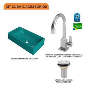 Sobre o ProdutoKit Cuba RL545 C/Torneira Luxo 1195 + Válvula 1'' (2,6cm) AmareloDescrição do ProdutoO Kit KTCARL545W.AM.LC70.V01 é uma combinação perfeita da Cuba de Apoio CARL545W.AM com acessórios complementares, prontos para instalação no seu lavabo ou móvel de banheiro. Ele conta com 1 Cuba de Apoio Retangular Roma 54,5X28,6cm Amarelo + 1 Torneira De Mesa Classic Luxo 1/4 De Volta 1195 C70 + 1 Válvula P/Lavatório 1" (2,6cm) V01 Metal Cromado + 0+ 0+ 0 , todos compatíveis e prontos para instalação.Itens Inclusos:1 Cuba de Apoio + 1 Torneira de mesa baixa + 1 Válvula de Escoamento Informações Logísticas:Vol.01 Comp.: 59,5cm Prof.: 34,5cm Alt.: 18cm Peso Bruto: 7,656Kg Observações:Não acompanha acessórios decorativos. Imagens meramente ilustrativas.Informações Técnicas / CaracterísticasCuba de Apoio Retangular Roma 54,5X28,6cm Amarelo Cor: Amarelo Marca: Compace Modelo: CARL545 Linha: Conect Formato: Retangular Tipo de Cuba: Apoio Material: Mármore Sintético Acabamento: Hard Lacca PU Escala de Brilho: Brilho Possui Ladrão: Não Possui Furação para Torneira: Sim Diâmetro do Furo para Torneira: (32mm) - DN 32 Diâmetro do Furo para Válvula: (40mm) - DN 40 Comprimento: 54,5cm Largura: 28,6cm Altura: 12,7cm Peso Líq.: 6,3Kg Recomendações de Uso, Manutenção e Limpeza: Utilize flanela seca ou pano macio, levemente umedecido com água. Evite contato com produtos químicos e abrasivos (solventes, thinner, acetona etc) e não utilize nenhum tipo de esponja de aço. Para maior brilho, recomendamos a utilização de cera automotiva n 2. Necessita de Montagem: Sim / Acompanha Manual de Montagem Complexidade da Montagem: Média: pode ser montado por mais de uma pessoa e/ou necessite de maior conhecimento para montagem. Garantia: 6 mesesTorneira De Mesa Classic Luxo 1/4 De Volta 1195 C70 Cor: Cromado Marca: Compace Modelo: CL1195 Linha: Classic Tipo de Torneira: Convencional Local: Lavatório Tipo de Instalação: De Mesa Acabamento: Camada de Cromo Salt Spray. Possui alta resistência contra corrosão, maresia, oxidação e descascamento. Material: Liga de Cobre (Bronze e Latão), Inox, Zamac, Elastômeros e Plásticos de Engenharia Possui Arejador Sim Tipo de Bica: Móvel Pressão Máxima: 40 m.c.a. Pressão Mínima: 2 m.c.a. Temperatura da Água Indicada: Mín.: 5 Celsius / Máx.: 70 Celsius Bitola do Cano: 1/2" Altura Total: 23cm Altura da base até a saída da água: 15cm Profundidade da saída da água até o final do cano: 14cm Peso Líq.: 0,48Kg Recomendações de Uso, Manutenção e Limpeza: Limpar apenas com pano macio e sabão neutro. Não usar produtos abrasivos como sapólio, palha de aço e produtos químicos. Garantia: 5 anosVálvula P/Lavatório 1" (2,6cm) V01 Metal Cromado Cor: Cromado Marca: Compace Modelo: CO1603V01 Linha: Complementos Tipo: Convencional Local: Lavatório Acabamento: Cromado Material: Zamak, Elastômeros e Plásticos de Engenharia. Bitola do Cano: 1" Possui Ladrão: Não Altura: 7cm Diâmetro: 5,5cm Altura Total: 7,5cm Peso Líq.: 0,09Kg Recomendações de Uso, Manutenção e Limpeza: Limpar apenas com pano macio e sabão neutro. Não usar produtos abrasivos como sapólio, palha de aço e produtos químicos. Necessita de Montagem: Sim Complexidade da Montagem: Média: pode ser montado por mais de uma pessoa e/ou necessite de maior conhecimento para montagem. Garantia: 5 anos